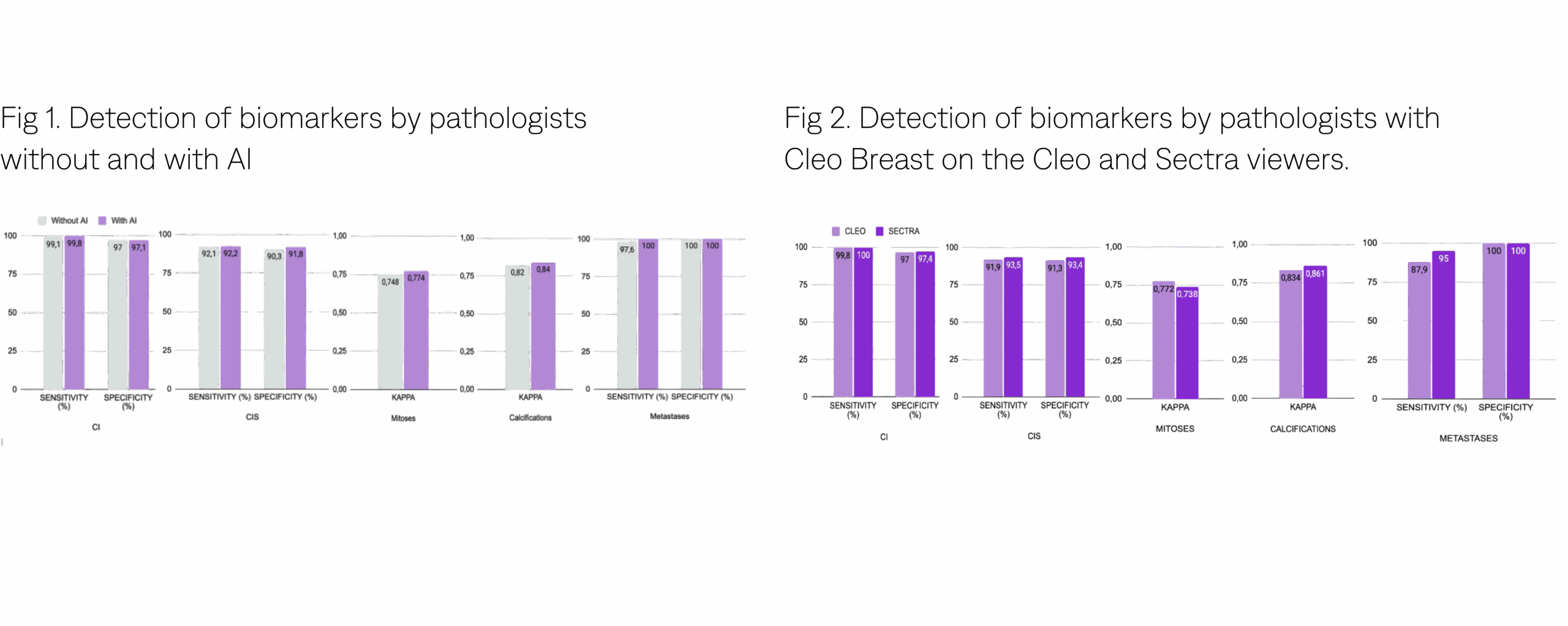 Cleo Breast demonstrates non-inferiority in diagnostic performance, showcasing high sensitivity in detecting invasive carcinoma (99.1% [98:99,7] without AI, 99.8% [99:100] with AI), carcinoma in situ (92.1% [89,7:94,1] without AI, 92,2% [89,8:94,2] with AI), mitotic scores (Kappa cohen’s 0.748 [0,717:0,78] without AI, 0.774 [0,744:0,805] with AI), calcifications (Kappa cohen’s 0.82 [0,795:0,846] without AI, 0.84 [0,816:0,864] with AI) and lymph node metastases (97.6% [93,2:99,5] without AI, 100% [97:100] with AI). (Fig 1).