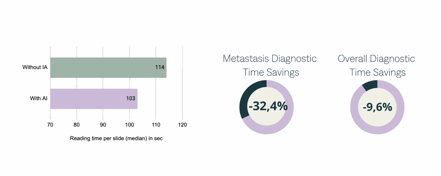 The results show a statistical non-inferiority in performance (up to 10% gain with AI) and a significant reduction in pathologist’s time (up to 50% time savings).